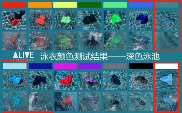 专门从事水上安全、培训和风险评估的Alive Solutions Inc 公司也在深浅游泳池和野外湖泊中对14种不同颜色的泳衣进行了测试,发现蓝色、白色泳衣在游泳池中具有较好的“隐蔽功能”: