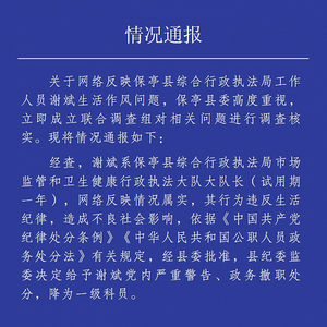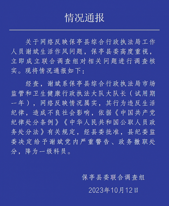 清廉保亭官微消息,保亭县委联合调查组10月12日通报,经查,谢斌系保亭县综合行政执法局市场监管和卫生健康行政执法大队大队长(试用期一年),网络反映情况属实,其行为违反生活纪律,造成不良社会影响,依据有关规定,经县委批准,县纪委监委决定给予谢斌党内严重警告、政务撤职处分,降为一级科员。