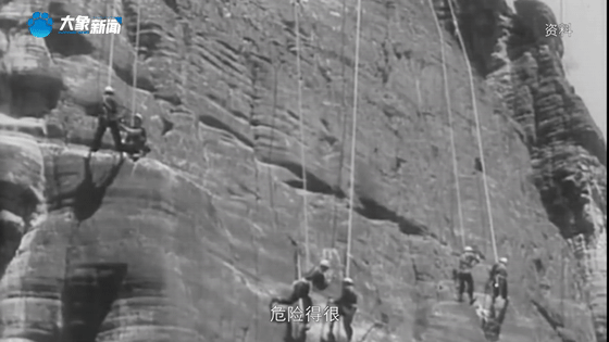在鸻鹉崖,年轻的修渠人腰系绳索