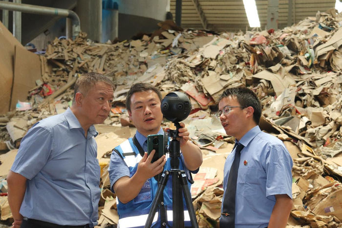 在涉案纸业公司内,云南省昆明市西山区检察院检察官通过“昆检慧视”3D全景影像辅助现场勘验。