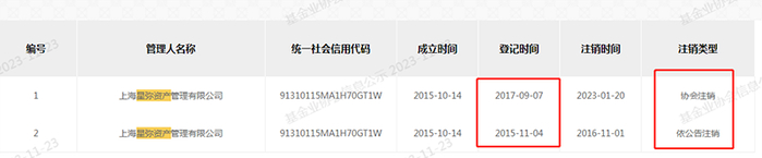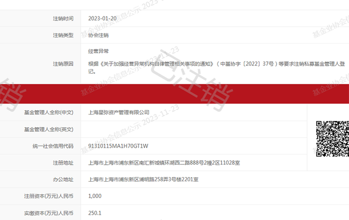 另外,上海星弥也已经注销。中国证券投资基金业协会(以下简称中基协)官网显示,上海星弥成立于2015年10月,曾两次在中基协进行登记,目前状态为已注销,中基协公布的注销原因为经营异常。