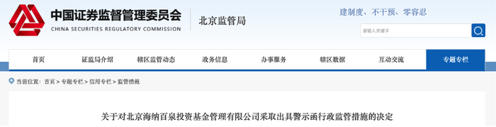 今年7月,胡海泉名下的私募北京海纳百泉投资基金管理有限公司(以下简称海纳百泉投资)因多项违规行为收到北京证监局的警示函。警示函显示,海纳百泉投资存在两项违规行为,包括:管理、运用私募基金财产,未能恪尽职守地履行诚实信用、谨慎勤勉的义务;未按照合同约定,如实向投资者披露可能影响投资者合法权益的其他重大信息。