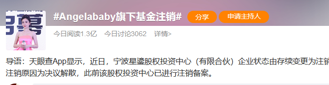 公开信息显示,杨颖旗下创投机构AB Capital所管理私募股权基金——宁波星鎏股权投资中心(有限合伙)的企业状态变更为注销,注销原因为决议解散。该股权投资中心的发起人之一是她的前夫、国内知名演员黄晓明,但后者已于2022年4月退出。该股权投资中心曾对外投资约20起,涉及旅游、消费、科技等多个行业。