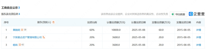 宁波星鎏的发起人之一是杨颖的前夫、国内知名演员黄晓明,认缴出资金额为1.08亿元,实缴出资额为60万元。但在2022年4月,黄晓明退出了该企业。
