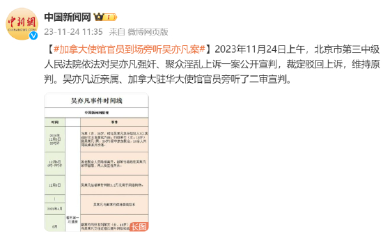 [#加拿大使馆官员到场旁听吴亦凡案#]2023年11月24日上午,北京市第三中级人民法院依法对吴亦凡强奸、聚众淫乱上诉一案公开宣判,裁定驳回上诉,维持原判。吴亦凡近亲属、加拿大驻华大使馆官员旁听了二审宣判。