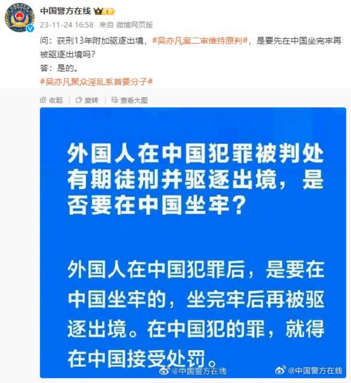 11月24日下午,公安部治安管理局在其官方微博确认,吴亦凡需要先在中国坐完牢再被驱逐出境。