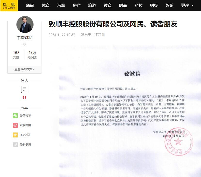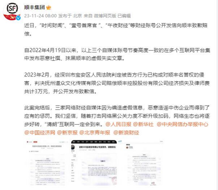 今日,券商中国记者从顺丰集团获悉,11月22日,知乎、同花顺、搜狐等平台陆续有“时间财闻”“壹号首席官 ”“午夜财经”等财经账号公开发信,向A股上市公司顺丰控股(002352)致歉赔偿。
