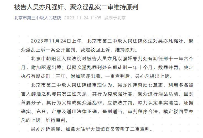 据北京市第三中级人民法院消息,11月24日上午,北京市第三中级人民法院依法对吴亦凡强奸、聚众淫乱上诉一案公开宣判,裁定驳回上诉,维持原判。