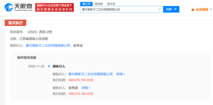 同日刷屏网络的,还有知名演员吴秀波。11月24日下午,话题#吴秀波及其公司被强执4.66亿#冲上热搜,引发网友热议。据中国执行信息公开网,近日,吴秀波及名下霍尔果斯不二文化传媒有限公司新增一则被执行人信息,执行标的4.66亿余元,涉及委托合同纠纷案件,立案时间为11月22日,执行法院为江苏省高级人民法院。