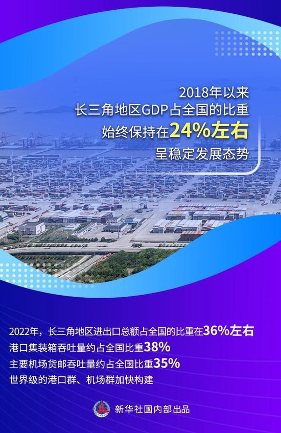 2022年,长三角地区进出口总额占全国的比重在36%左右,港口集装箱吞吐量约占全国比重38%,主要机场货邮吞吐量约占全国比重35%,世界级的港口群、机场群加快构建。