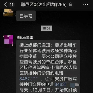 发布上述通知的公司是鄠邑区宏达出租车服务有限公司(下称宏达公司)。通知还提到,自12月7日起,出租车司机可以在鄠邑区人民医院、西安济仁医院接种门诊预约接种新冠疫苗,并附有预约电话。