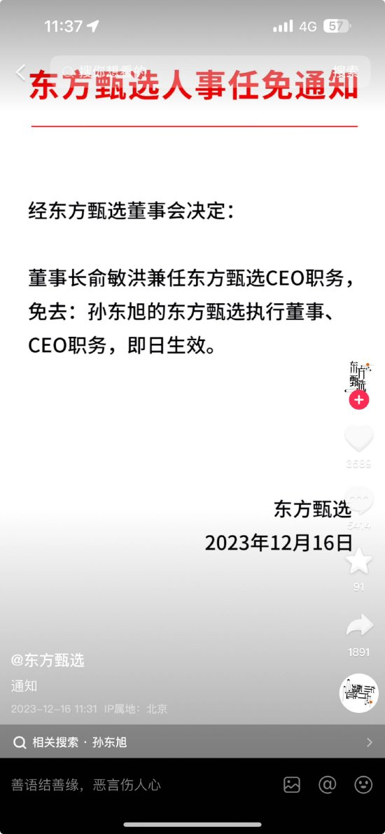 12月16日,东方甄选公告称免去孙东旭东方甄选执行董事、CEO职务,董事长俞敏洪兼任东方甄选CEO职务。
