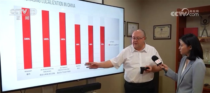 艾菲汽车零部件亚太区首席执行官 埃里克·勒迈尔:从这张图表中可以看出,就电机而言,我们使用的电机有80%来自当地供应商,磁铁则100%来自当地供应商,当地供应商质量好、价格也低。