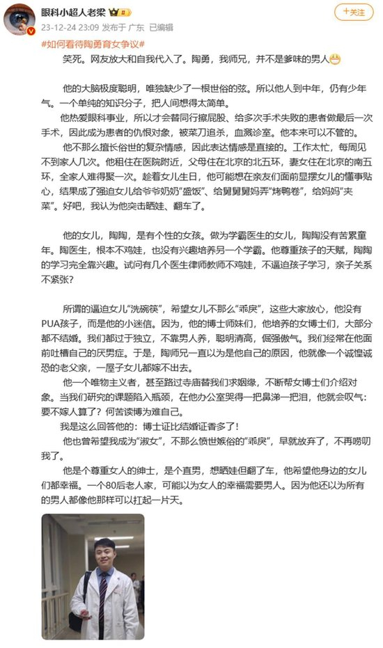 12月24日深夜,拥有超330万粉丝的医生大V“眼科小超人老梁”发长文力挺陶勇,称他是自己的师兄,并不是爹味的男人。