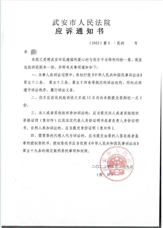 2024年1月9日,河北石家庄武安市“民建福利爱心村”诉原法定代表人李艳霞不当得利纠纷案,在河北省女子监狱开庭,此案涉及金额达一千六百余万元。