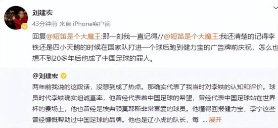 有球迷表示,“我还清楚的记得李铁还是四小天鹅的时候在国家队打进一个球后跑到健力宝的广告牌前庆祝,怎么也想不到20多年后他成了中国足球的罪人。”刘建宏则回复称,“那一刻我一直记得”。