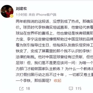 刘建宏写道:“两年前我说的这段话,没想到成了热点。那确实代表了我当时对李铁的认知和评价。球员时代李铁确实坦诚直率,他曾经代表着中国足球的希望,曾经代表中国足球站在世界杯的赛场上,他也曾经是埃弗顿莫耶斯非常喜爱的球员。他懂得回报健力宝、李宁这些曾经慷慨帮助过中国足球的品牌。他也是辽小虎的队长,每年张罗着为张引指导过生日,给残疾队友曲乐恒安排工作。