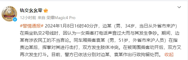 ·上海地铁2号线内男子发表涉农民工不当言论引发肢体冲突,警方通报:两人被行拘。
