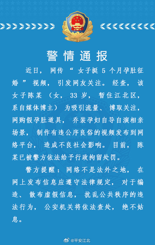 ·女子挺5个月孕肚征婚?重庆警方通报:涉事陈某已被依法行政拘留。