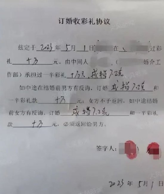 2023年5月1日,在中间人见证下,27岁席某某和24岁女子在阳高县举行订婚宴,男方给了女孩一半彩礼10万元(迎娶时付另一半)和一枚7.2克金戒指,甄女士夫妇还承诺结婚一年后,面积90多㎡的婚房房产证上加上女方名字。