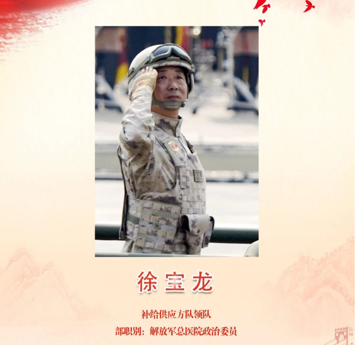 后勤装备保障模块中首先接受检阅的是补给供应方队,领队之一就是当时担任中国人民解放军总医院政委的徐宝龙少将。