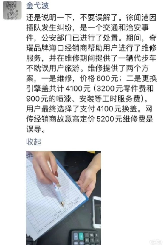 奇瑞新闻发言人金弋波也发朋友圈表示:“奇瑞品牌海口经销商帮助用户进行了维修服务,并在维修期间提供了一辆代步车不耽误用户旅游。维修提供了两个方案,一是维修,价格600元;二是更换引擎盖共计 4100元(3200元零件费和900元的喷漆、安装等工时服务费)。用户最终选择了支付 4100元换盖。网传经销商故意高定价5200元维修费是误导。”