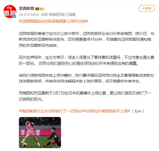 迈阿密国际香港行主办方公告中表示,迈阿密国际在合约中承诺梅西、阿尔巴、布斯克茨和苏亚雷斯除非受伤,否则需要登场45分钟,可惜最后迈阿密国际通知梅西和苏亚雷斯因伤缺阵。