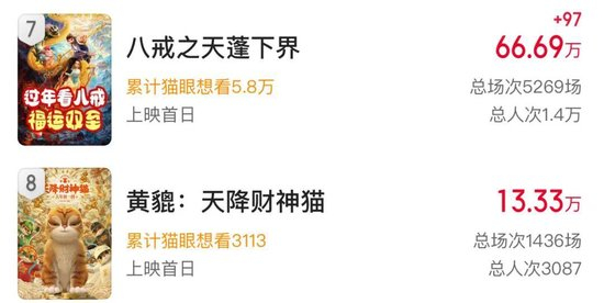 值得注意的是,除了这些头部电影外,还有两部春节档的电影票房不到百万,其中动画电影《黄貔:天降财神猫》目前总票房仅13.33万。