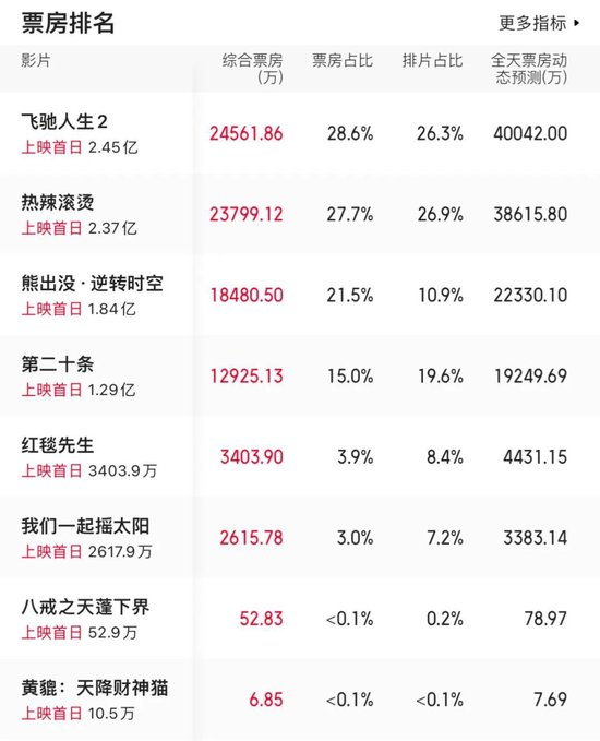 从目前的统计数据来看,《热辣滚烫》与《飞驰人生2》的票房和排片数据差距并不大,但张艺谋导演、马丽主演的《第二十条》票房已略显颓势,在排片占比大幅领先的情况下票房表现还比不上《熊出没》,与前两名已相距甚远。此外,宁浩导演、刘德华主演的《红毯先生》成绩更是惨不忍睹,8.4%的排片占比才拿到3000多万票房。