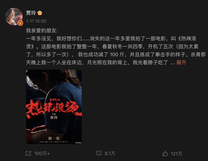 电影外,贾玲在1月11日写下一条微博,自述为拍《热辣滚烫》花一年时间减重100斤,她的减肥心路历程也被当作《热辣滚烫》电影彩蛋在片尾进行播放,引发观众热议。