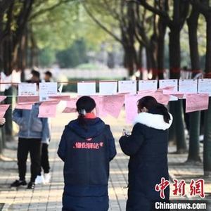 资料图:在合肥市大蜀山森林公园一处“相亲角”内悬挂的相亲简介吸引民众驻足。 韩苏原 摄