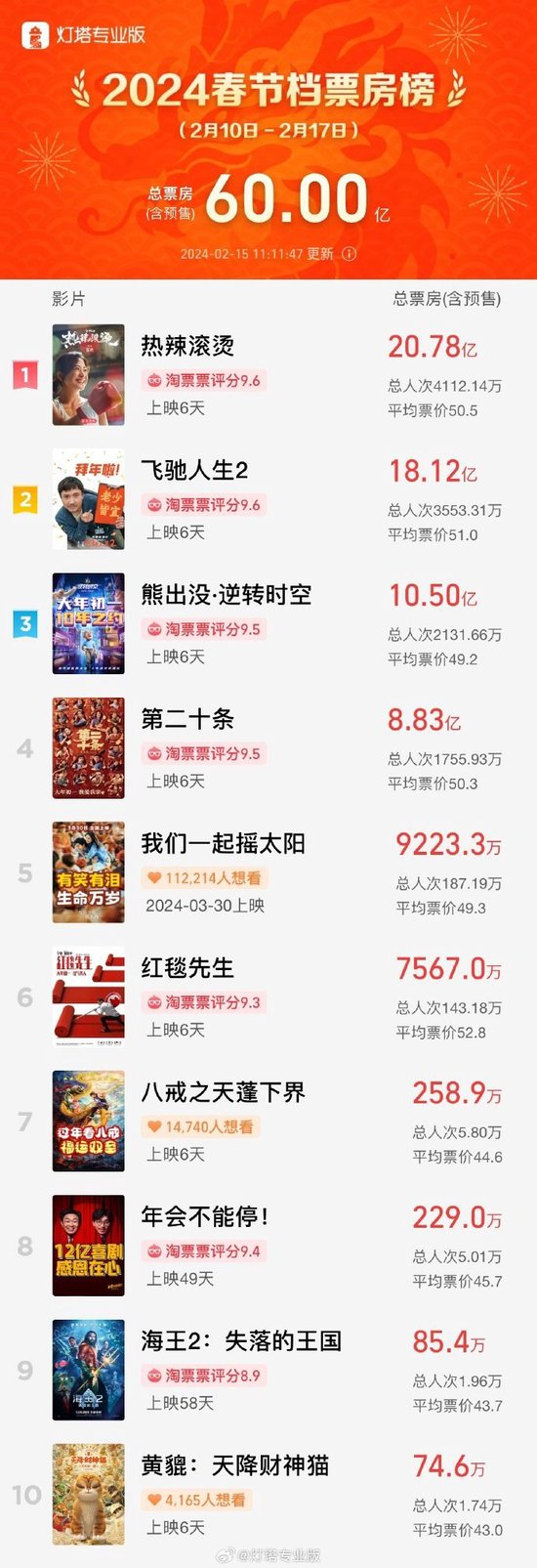 据灯塔专业版数据,截至2月15日11时11分,2024年春节档(2月10日—2月17日)档期总票房(含预售)突破60亿。《热辣滚烫》《飞驰人生2》《熊出没·逆转时空》暂列档期票房前三位。