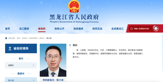 黑龙江省政府官网更新显示,今年1月底跨省履新的黑龙江省委常委、常务副省长陈少波,已经同时担任省委金融办主任、省委金融工委书记。