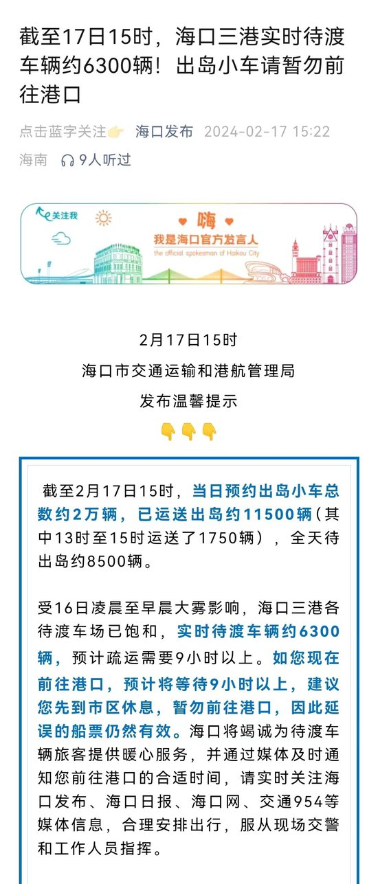 文中还称,受16日凌晨至早晨大雾影响,海口三港各待渡车场已饱和,实时待渡车辆约6600辆,预计疏运需要9小时以上。如您现在前往港口,预计将等待9小时以上,建议您先到市区休息,暂勿前往港口,因此延误的船票仍然有效。海口将竭诚为待渡车辆旅客提供暖心服务,并通过媒体及时通知您前往港口的合适时间,请实时关注海口发布、海口日报、海口网、交通954等媒体信息,合理安排出行,服从现场交警和工作人员指挥。