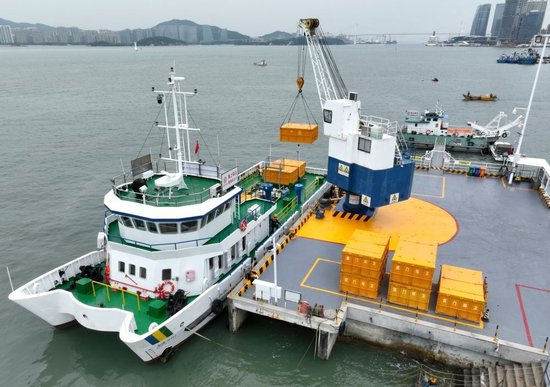 2024年1月25日,工作人员在厦门西堤海上环卫码头吊运海漂垃圾(无人机照片)。新华社记者 林善传 摄
