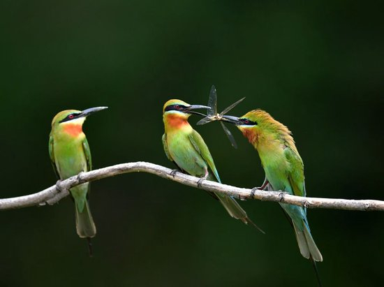 在厦门五缘湾栗喉蜂虎自然保护区骑马山片区,一只栗喉蜂虎雄鸟(右)给两只雌鸟喂食昆虫(2023年5月20日摄)。新华社记者 魏培全 摄