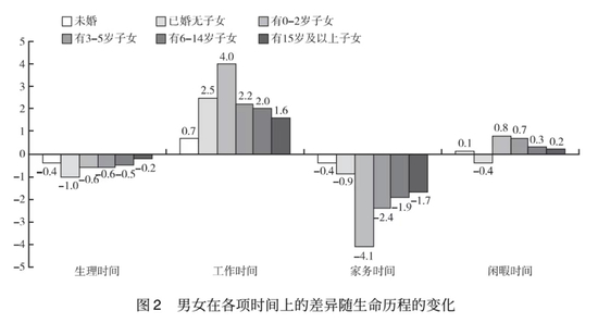 如图4所示,当个体处于未婚状态时,男女在各项时间利用方式上的差异虽然存在,但都很小。但是,随着结婚和生育事件的发生,男女在时间利用方式上的差异越来越大。