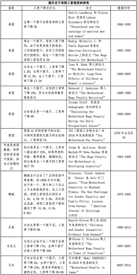 根据南京大学社会学院副教授许琪发表在2021年第5期《社会学研究》上的论文《从父职工资溢价到母职工资惩罚——生育对我国男女工资收入的影响及其变动趋势研究(1989-2015)》,生育子女之后,传统的性别角色观念要求女性将更多的时间和精力投入子女照料,这会影响她们在劳动力市场的表现,导致“母职工资惩罚”(motherhood wage penalty);而男性的收入不仅不会受到生育的负面影响,反而会因传统家庭角色赋予的养家需要而更加努力地工作,出现“父职工资溢价” ( fatherhood wage premium)。