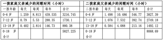 养育孩子也会减少父亲的闲暇时间。在一孩家庭中,孩子处于0~6岁、7~12岁和13~18岁时,父亲每周闲暇时间分别减少8.8小时、5.5小时、2.8小时。对相应年龄段的二孩家庭,父亲每周闲暇时间分别减少10.5小时、7.5小时、4.1小时。总的来说,一孩在0-18岁期间,父亲平均每周闲暇时间减少5.9小时;二孩在0-18岁期间,父亲养育两个孩子平均每周闲暇时间减少8.2小时。