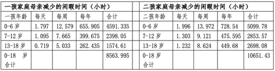 研究发现,养育孩子会显著减少母亲的闲暇时间。在一孩家庭中,孩子处于0~6岁、7~12岁和13~18岁时,母亲每周闲暇时间分别减少12.6小时、7.7小时、5.0小时。对相应年龄段的二孩家庭,母亲每周闲暇时间分别减少14.0小时、9.1小时、8.6小时。总的来说,一孩在0-18岁期间,母亲平均每周闲暇时间减少8.7小时;二孩在0-18岁期间,母亲养育两个孩子平均每周闲暇时间减少10.8小时。