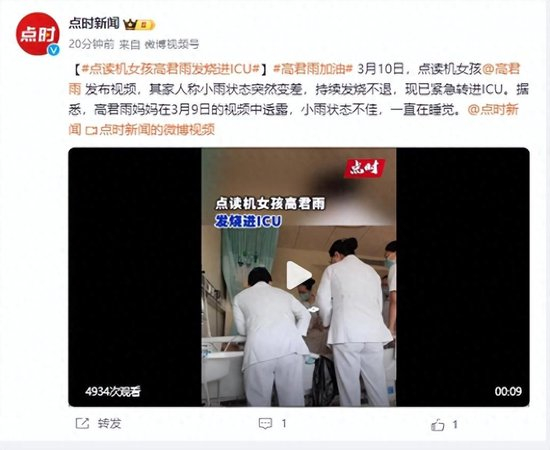 3月10日,点读机女孩@高君雨 发布视频,其家人称小雨状态突然变差,持续发烧不退,现已紧急转进ICU。据悉,高君雨妈妈在3月9日的视频中透露,小雨状态不佳,一直在睡觉。