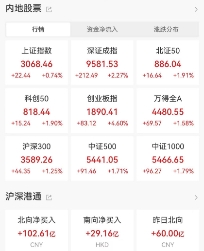 全市场共4483只个股上涨,781只个股下跌,北向资金净买入近103亿元。