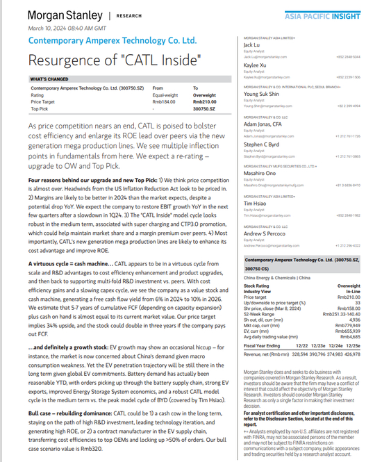 摩根士丹利将CATL(宁德时代)的评级从“持平”上调至“超配”(Overweight),并将目标价格从人民币184元上调至210元。