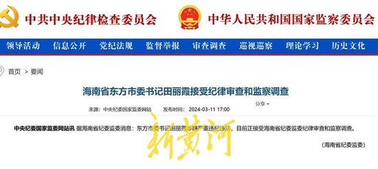 3月11日,海南省纪委监委通报,东方市委书记田丽霞涉嫌严重违纪违法,目前正接受海南省纪委监委纪律审查和监察调查。