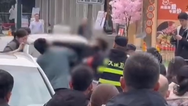视频中一辆白色轿车停在道路中央,对向车道不少电动车正在行驶,交通显得异常拥堵。一名身穿绿色衣服的男子与另一名黑色衣服男子发生冲突,旁边身着武大保卫制服的工作人员试图将两人分开。