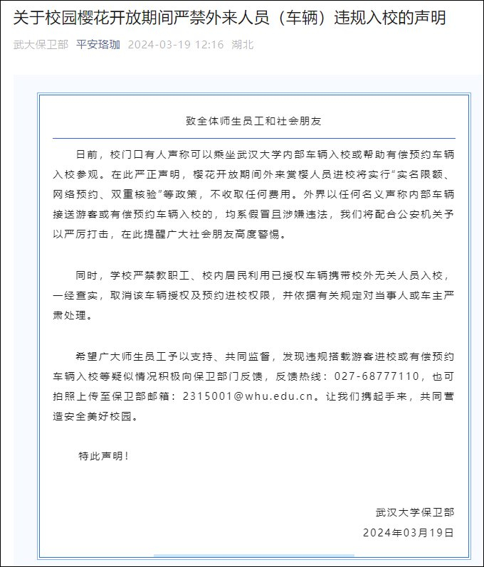 武汉大学保卫部微信公众号“平安珞珈”3月19日发布《关于校园樱花开放期间严禁外来人员(车辆)违规入校的声明》。