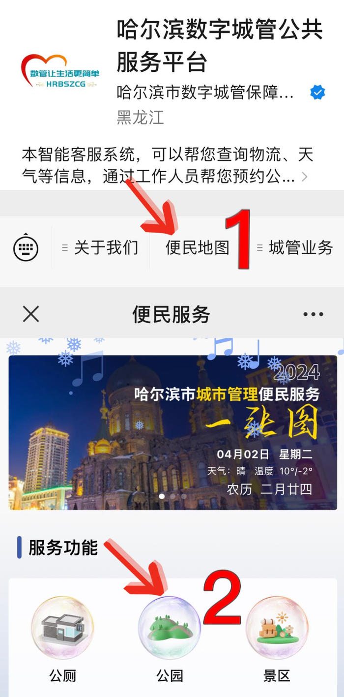 可以通过[哈尔滨数字城管公共服务平台]微信公众号上的[便民地图]查询公园位置。