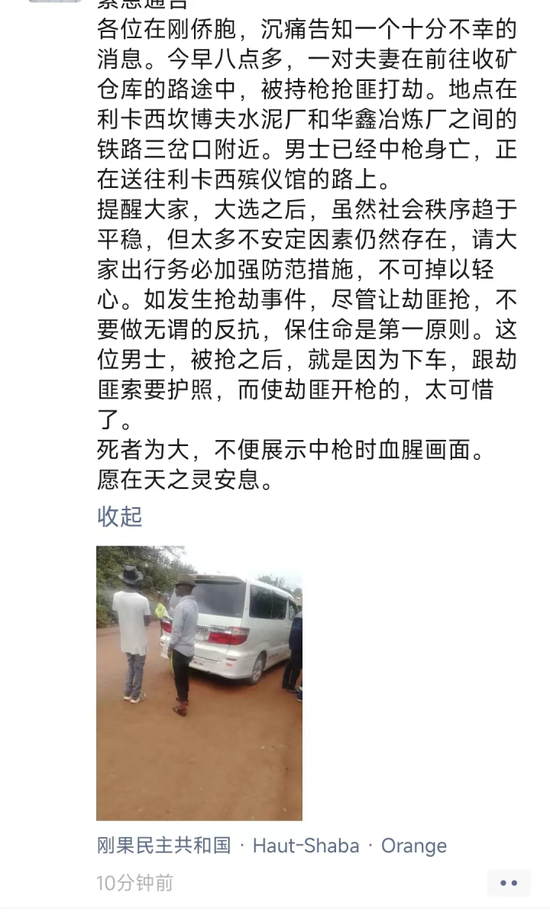 各位在刚侨胞,沉痛告知一个十分不幸的消息:今早八点多,一对夫妻在前往收矿仓库的路途中,被持枪抢匪打劫。地点在利卡西坎博夫水泥厂和华鑫冶炼厂之间的铁路三岔口附近。男士已经中枪身亡,正在送往利卡西殡仪馆的路上。