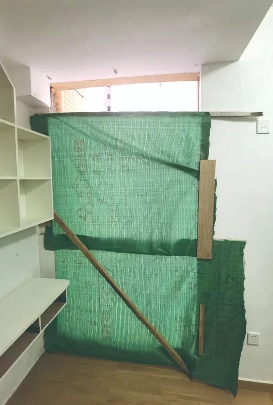 “次卧玻璃窗我没用开发商提供的,自己找人加装的。昨天我担心下雨,拿了两块绿布和木头封了起来。过几天我打算做一个平开窗,稳定性强一些。不过定做需要一个星期,希望这段时间风不要那么大……”