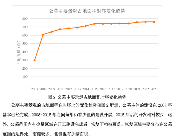 2003年以来的历年影像图片显示,近十余年来,整个太平陵公墓区域侵占林地和破坏植被较为严重的有两处,一是公墓南部山头的砍伐,破坏面积47亩左右,后续大约有21亩的恢复了植被;二是公墓东部区域的山体破坏和砍伐,最近在2022年仍有植被破坏现象,破坏面积22亩左右。